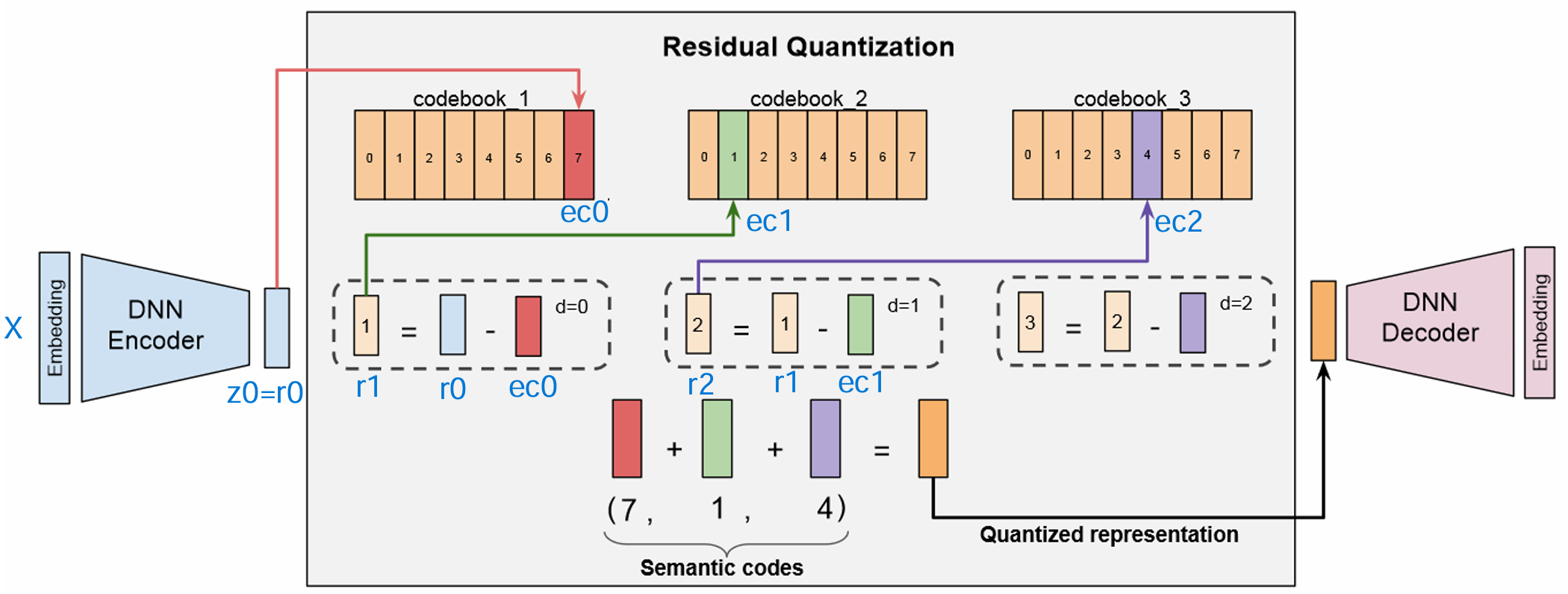 - 第一级量化时,模型在第0层码本 中找到与 最接近的码本向量 ,记录其索引 作为第0级码字。然后计算残差 ,将未被码字解释的细节留存下来。